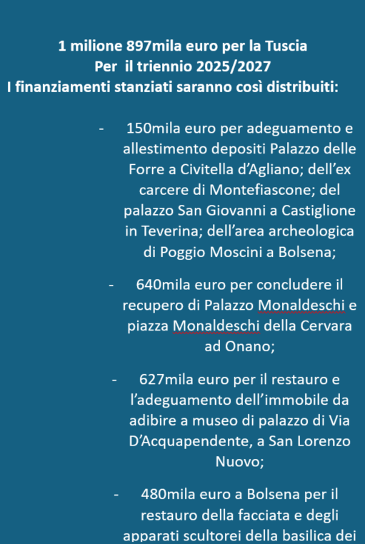 L’arch. Eichberg non ha mancato di ricordare come solo da poco il Consiglio superiore dei Beni culturali abbia approvato lo stanziamento di fondi destinati al patrimonio storico della provincia di Viterbo. Si tratta di un finanziamento complessivo di circa 1.897.000 euro, ripartiti nel triennio 2025/2027, volti a “riqualificare edifici di pregio”. A comunicarlo lo stesso deputato Mauro Rotelli, presidente della Commissione Ambiente, Territorio e Lavori pubblici.