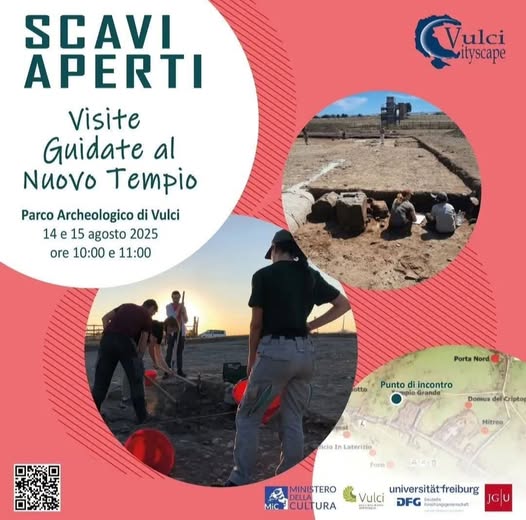 Al Parco archeologico naturalistico di Vulci la possibilità, come ogni anno, di ammirare gli scavi aperti di Vulci in corso nell’ambito del progetto “Vulci Cityscape”. Davanti agli occhi attenti dei visitatori interessati, si disveleranno i resti del tempio scoperto di recente. Qui inseriscono le due visite guidate ad ingresso libero, organizzate per il 14 e 15 agosto, in due turni: alle ore 10 e alle ore 11. Con appuntamento dietro il Tempio Grande.