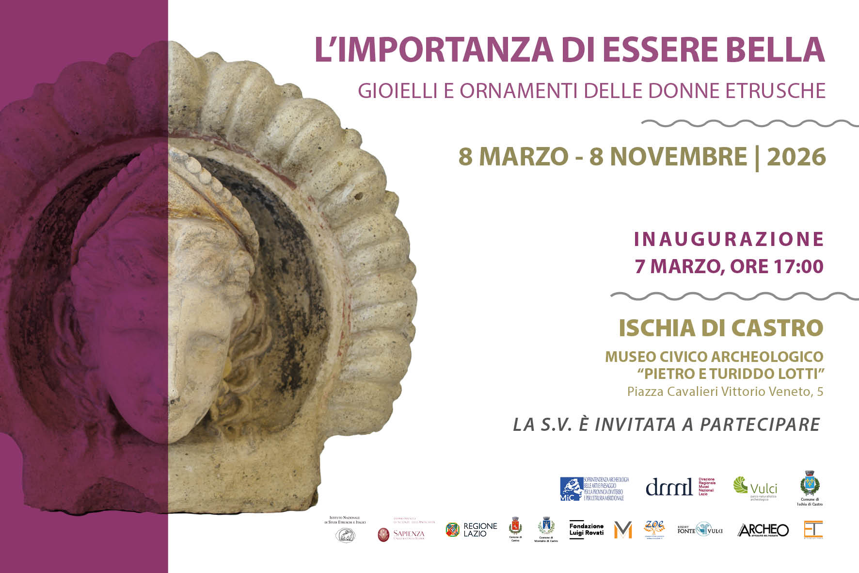 In occasione delle celebrazioni per la Giornata Internazionale della Donna, il giorno 7 marzo 2026, presso Museo Civico “Pietro e Turiddo Lotti” di Ischia di Castro sarà inaugurata la mostra “L’importanza di essere bella. Gioielli e ornamenti delle donne etrusche”.