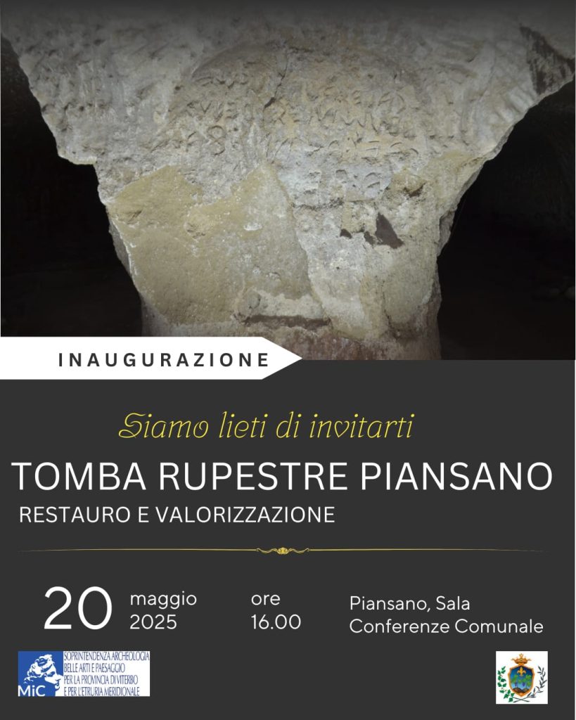 Il giorno 20 maggio 2025 si terrà l’inaugurazione del nuovo allestimento espositivo della “Tomba rupestre etrusca”, monumento funerario ipogeo rinvenuto a Piansano in modo fortuito durante lavori di sbancamento per la realizzazione di opere viarie negli anni Ottanta del secolo scorso, ed oggetto di recenti interventi di restauro e valorizzazione finanziati con fondi del Piano Nazionale di Ripresa e Resilienza (PNRR), linea di intervento Caput Mundi “Percorsi giubilari (dalla Roma pagana a quella cristiana)”.