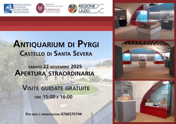 Sabato 22 novembre 2025, in occasione delle aperture straordinarie comprese nell’ambito del piano di valorizzazione del Ministero della Cultura, saranno disponibili due visite guidate, all’Antiquarium di Pyrgi e all’interno del Castello di Santa Severa, in due turni, alle ore 15.00 e alle ore 16.00, a cura degli archeologi di Università Sapienza di Roma, che da anni è attiva nell’area.