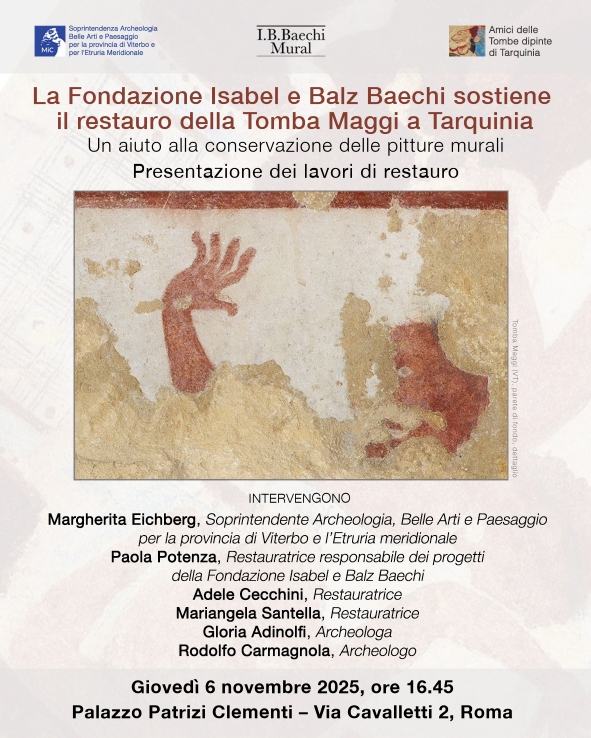 Nella Tomba Maggi, la Fondazione ha voluto sostenere un intervento che supera la sola conservazione materiale, riaffermando il restauro come gesto di conoscenza e responsabilità verso la storia, l’arte e l’archeologia a tutela della bellezza fragile che ancora testimonia, attraverso la materia e il colore, la visione del mondo e i riti di una civiltà perduta.